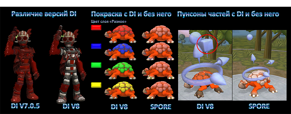 Dark Injection- это одна из лучших модификаций на игру Spore сделанная одним из лучших "мододелов" Davo. Ещё не одна модификация не добавляла таких революционных возможностей в игру. По своему размеру-это полноценное дополнение для Spore, добавляющее около 820 новых частей, включающих в себя части Гроксов, части Клеток и совершенно новые части из игры Darkspore. Также модификация добавляет около 100 световых эффектов, которые ставятся на существа, 20 новых способностей, добавляющих вашем существам новые анимации при выстрелах, ударах и т.д, 50 совершенно новых вариантов покраски для ваших существ. Данный мод- единственный мод, который полностью отключает Индикатор сложности в редакторе Существ на игре версии 1.05.01. Модификация сильно растягивает Индикатор сложности в редакторе построек, а также позволяет вращать все части построек по всем трём осям при нажатии "Tab"!